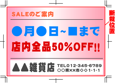 「塗り足し」と同様に、断裁位置(用紙サイズの端)から3ミリ以内に必要なコンテンツや画像等を配置されますと、断裁のズレによりそれらがカットされる場合があります。
