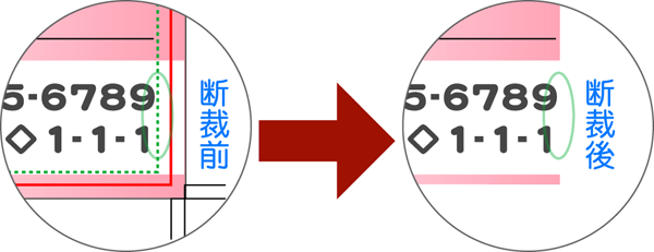 断裁位置(用紙サイズの端)から、3ミリ以内に必要なコンテンツが入っている状態で断裁すると
